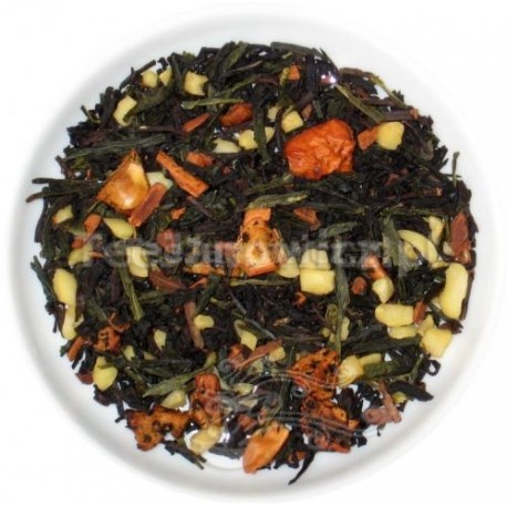Wspaniała aromatyczna mieszanka czarnej i zielonej herbaty. Niepowtarzalny smak pieczonego jabłuszka oczaruje każdego, wprowadzając w miły, pełen ciepłych wspomnień nastrój. Skład: czarna i zielona herbata z Indii, Chin i Cejlonu zmieszana z kawałkami jabłek i migdałów, cynamonem i aromatem.